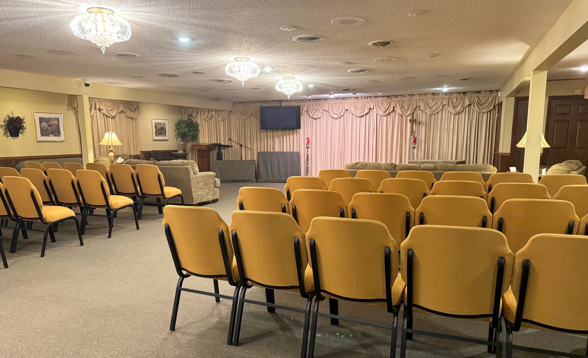 The building is located on one level with large spacious rooms, plenty of onsite parking, a home-like setting, seating for 300, large, and flat-screen TVs for video tributes.