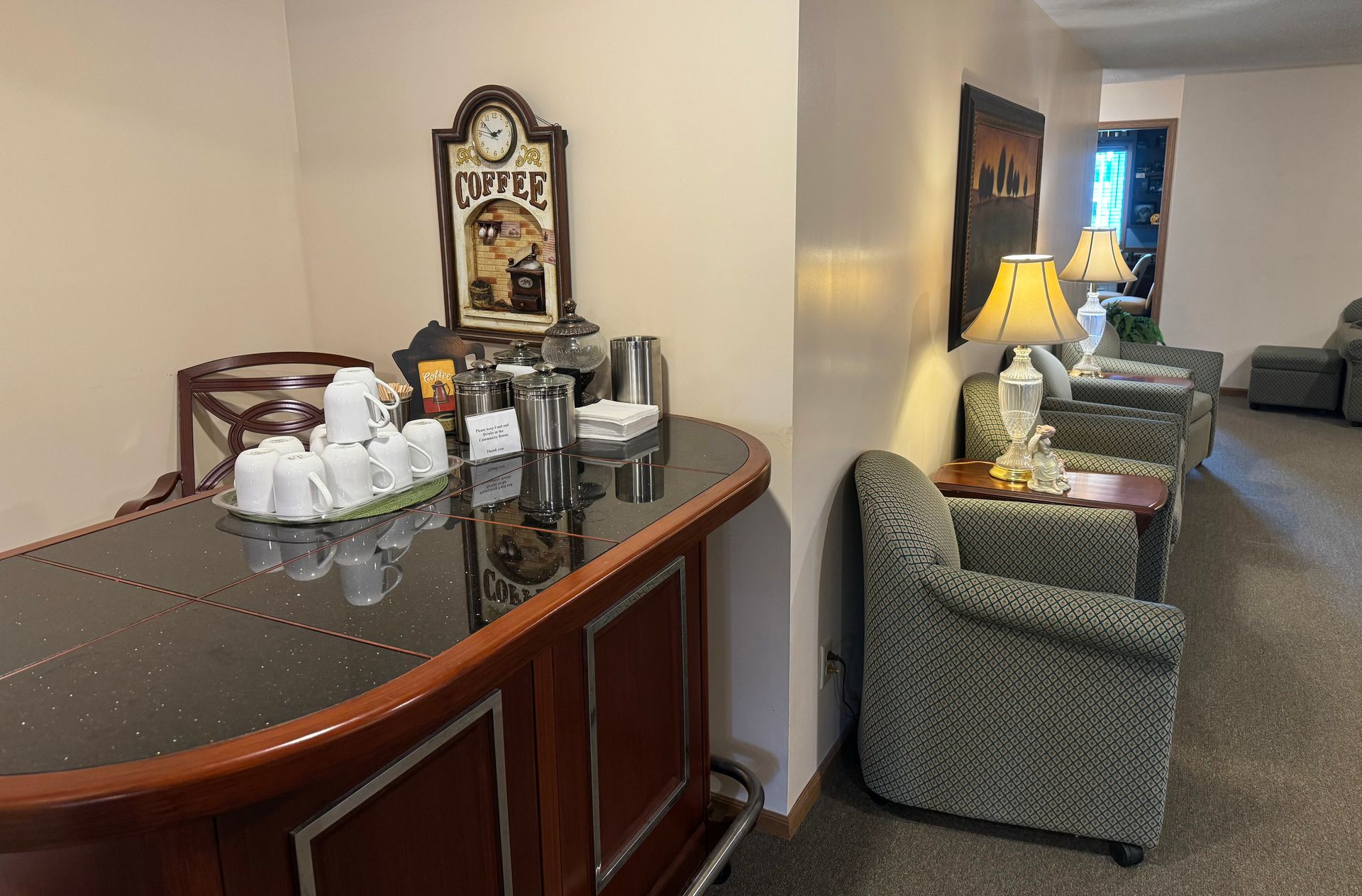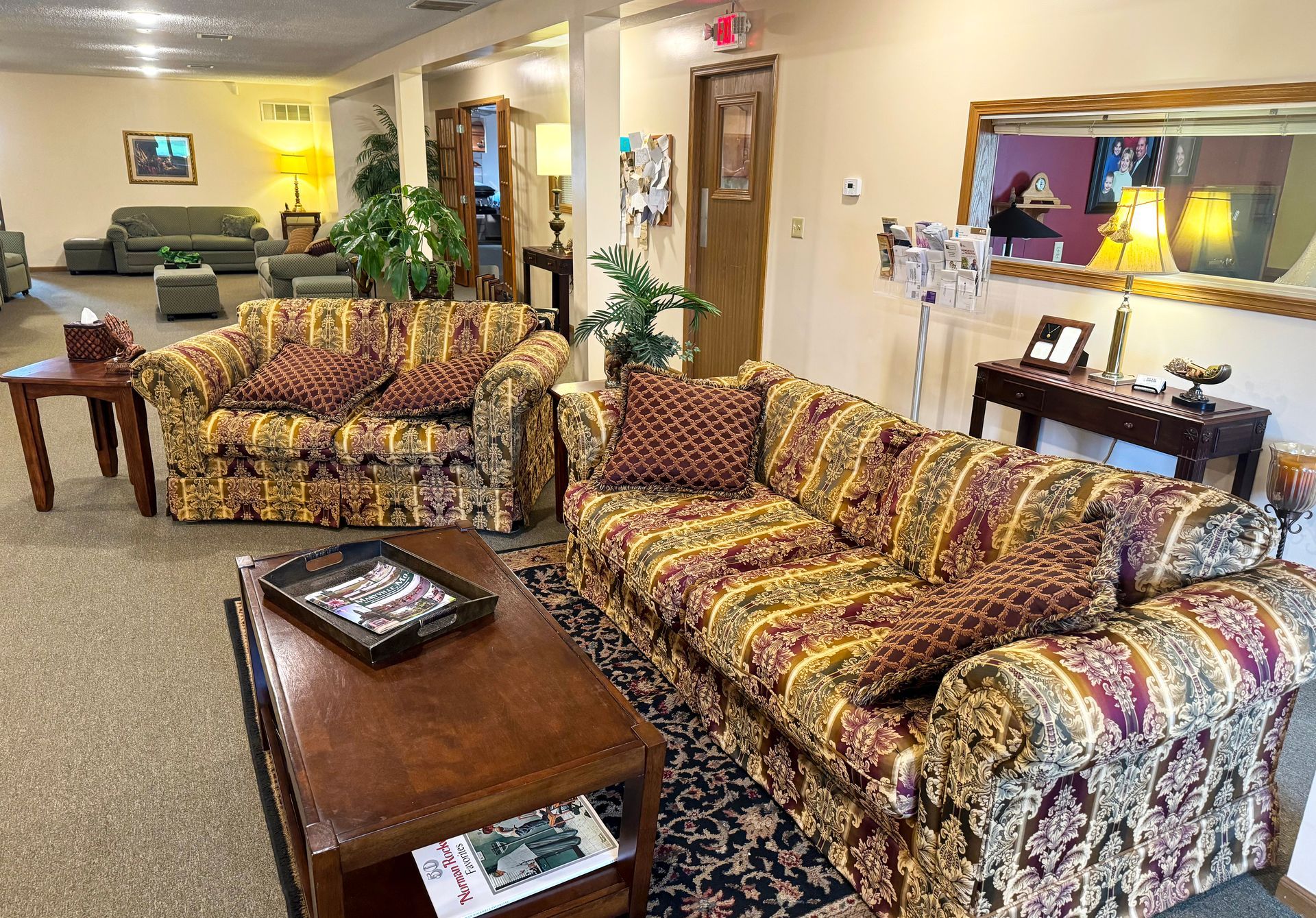 The Bram Funeral Home is located in the Old USDA Building on E. South Hills Drive. We are proudly accessible to the public, with no steps to access the facility. The men's and women's restroom's are large and handicap accessible. Our main chapel will seat 172, with a private family room with seating for 53 and a quiet room for families with small children. We have seating for over 300, and TV monitors broadcast the service throughout the building.